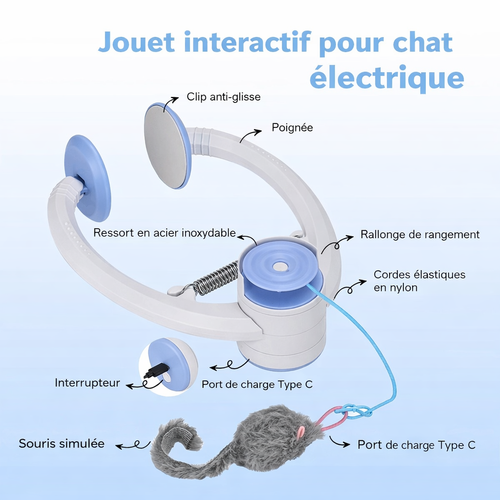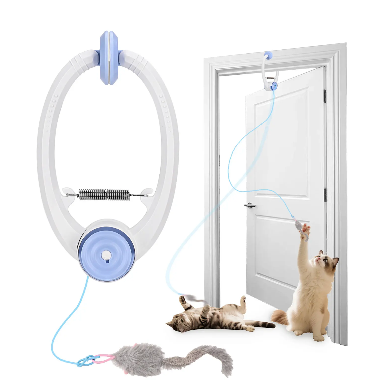 Un jouet interactif pour chat qui se fixe au cadre de porte et utilise un mécanisme à bouton-poussoir pour faire monter et descendre une souris jouet, offrant un jeu stimulant et entièrement mains libres.
